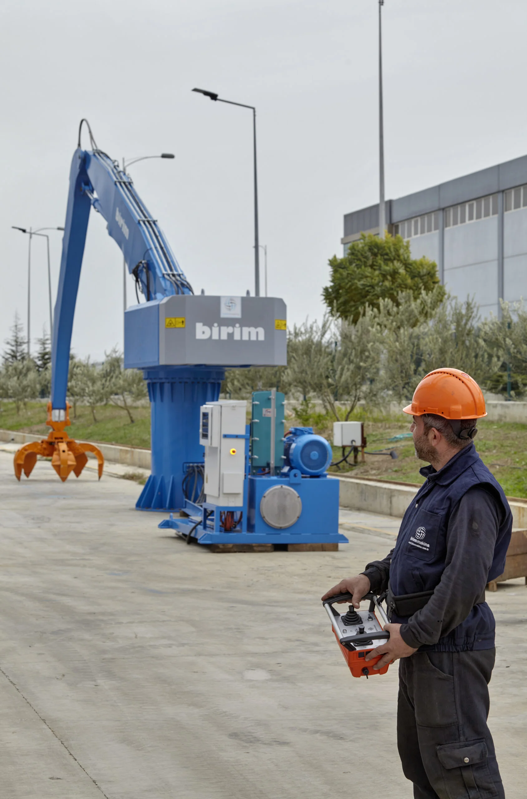The machine is designed for remote-controlled operation, allowing the operator to work safely at a distance from the melting furnace, and includes a hydraulic system protected against molten metal splashes and high temperatures.